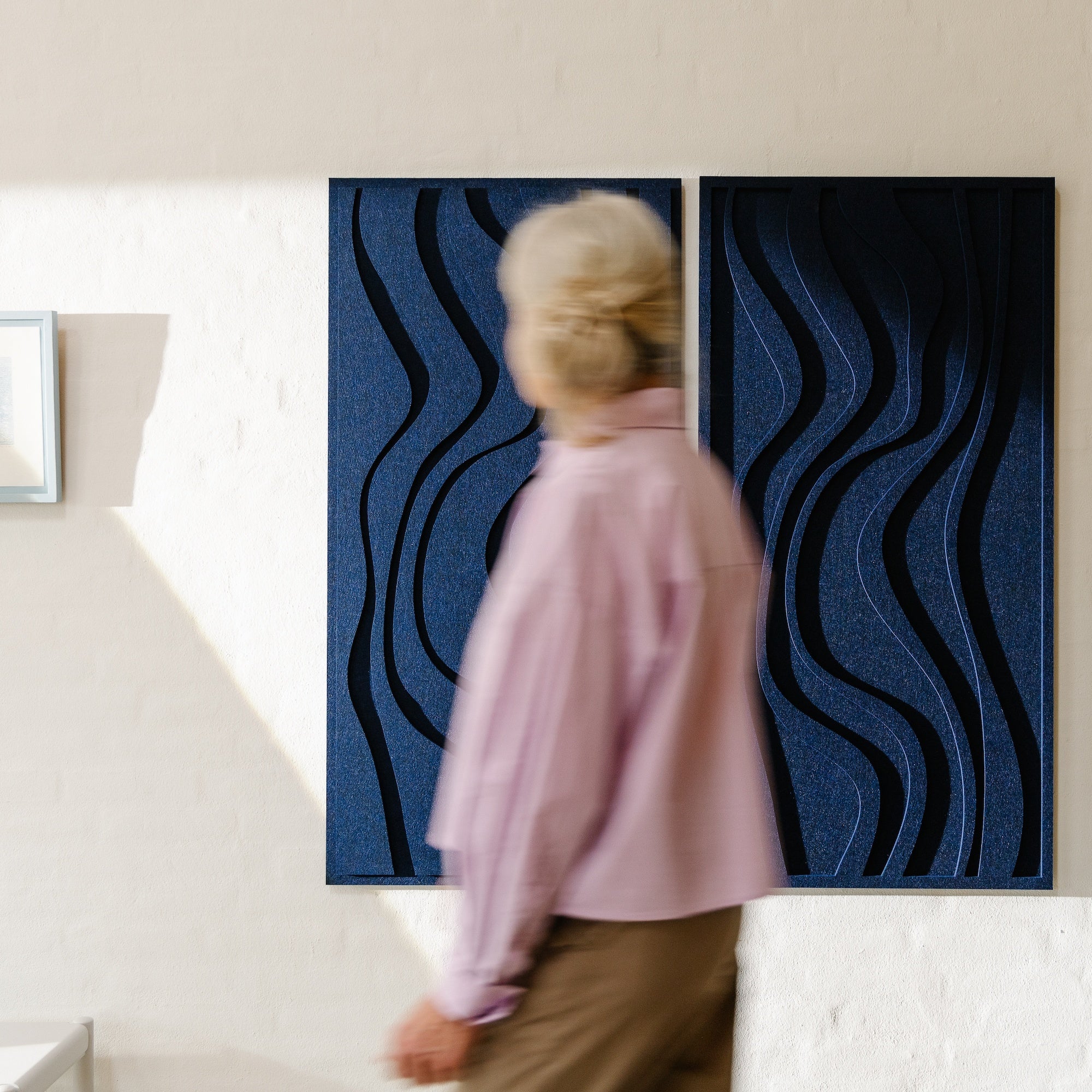 Hang them as you like, close or apart - Get playful! Each piece features its own unique mounting system attached at the back, allowing you the freedom to arrange them as you please. Plus, a wall bracket is provided for each artwork, ensuring effortless installation and versatility in display. The simple setup also makes it easy to take the artworks with you, rearrange them and create new expressions in your space – again and again. This flexibility gives you the freedom to play with your interior, effortlessly.